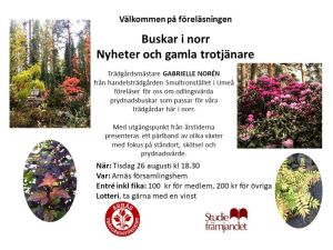 Det är trädgårdsmästare Gabrielle Norén från Smultronstället i Umeå som ska lära oss om prydnadsbuskar som är lämpliga för oss här i norr. Sorterna presenteras med fokus på ståndort, skötsel och prydnadsvärde.