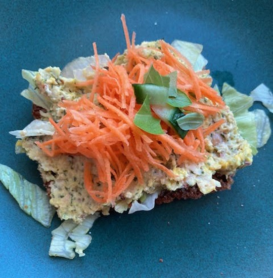 Servera på grovt bröd med lite majonnäs och isbergssallad. På toppen läggs lite riven morot och hackad persilja.