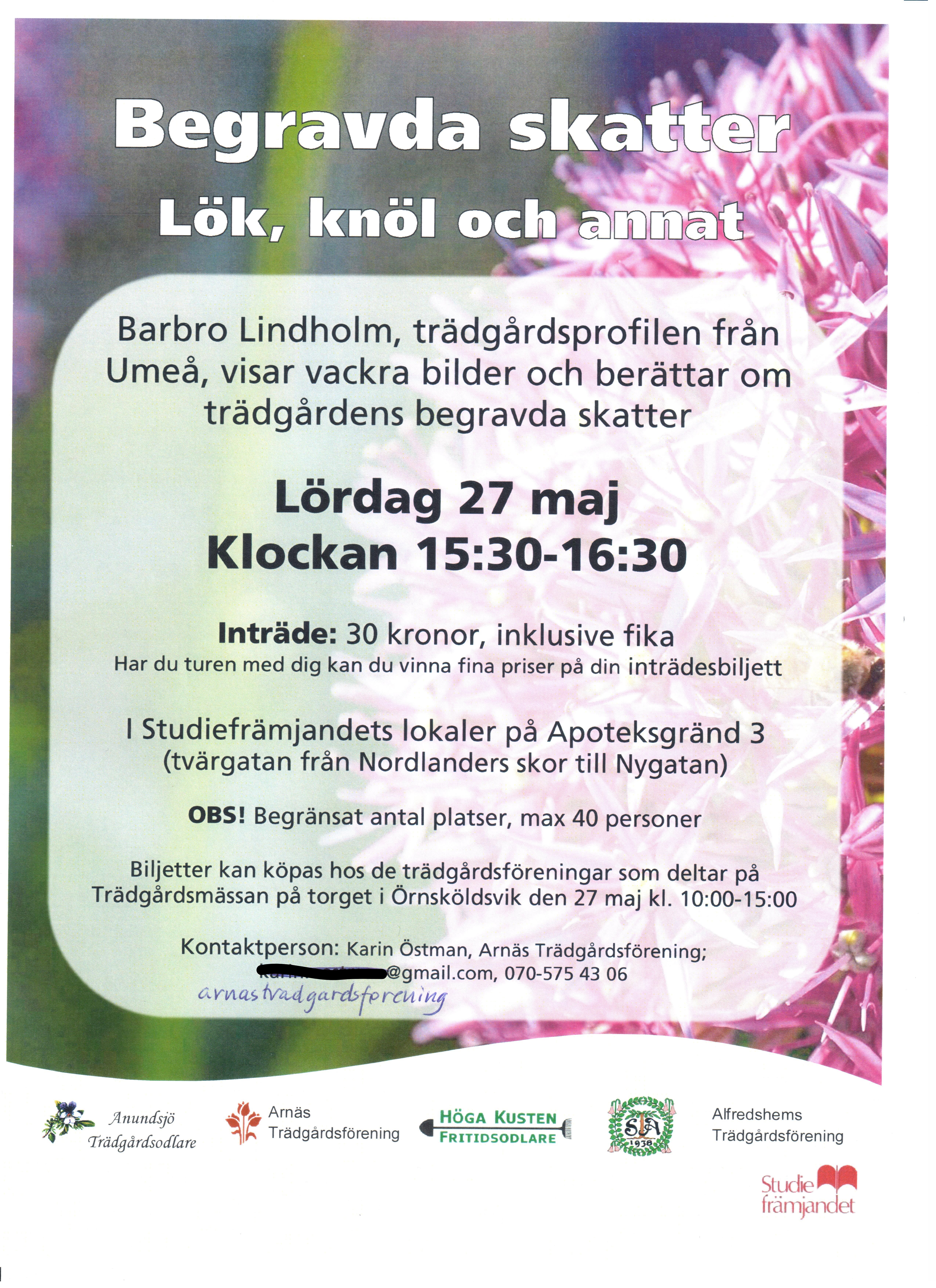 Lördagen den 27/5 10.00-15.00 deltar vi i Trädgårdsmässan på Torget, Örnsköldsvik. Besök mässan och ta del av vad föreningen deltar med. Årets tema: Trotjänarna i våra rabatter, perennerna.