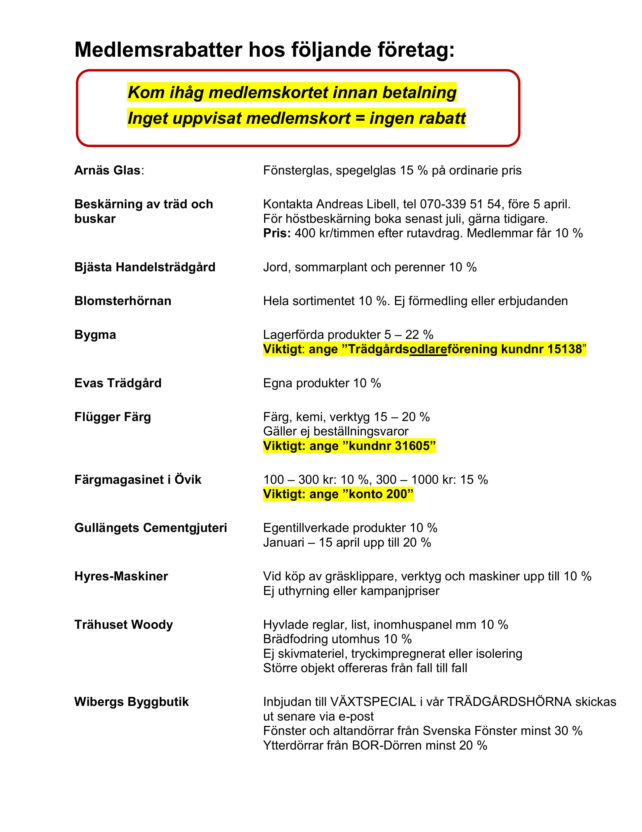 Här kommer de lokala medlemsrabatterna. Du vet väl att via ditt medlemskap i Riksförbundet Svensk Trädgård får du bl a tidningen Hemträdgården, fri rådgivning och olika rabatter, hos samarbetspartners och i butiken? Kolla på hemsidan http://www.svensktradgard.se.